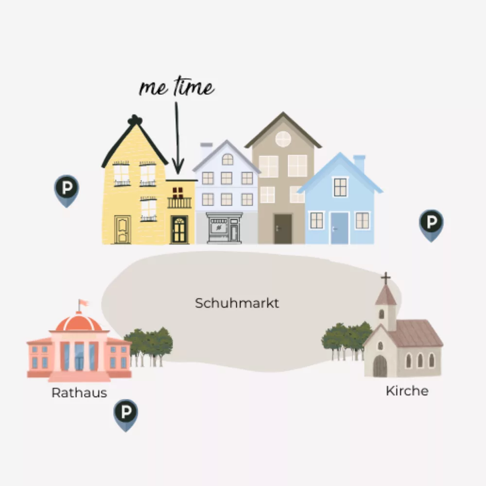 In der Innenstadt auf dem Schuhmarkt 4a in 19370 Parchim befindet sich mein me time Zuhause, umgeben von einer der Kirchen Parchims, dem Rathaus und Geschäften. Du kannst die vielen kostenpflichtigen Parkmöglichkeiten dort nutzen, oder Am Fischerdamm kostenfrei auf einem großen Parkplatz parken. Dieser ist zu Fuß 5 Minuten von me time entfernt.