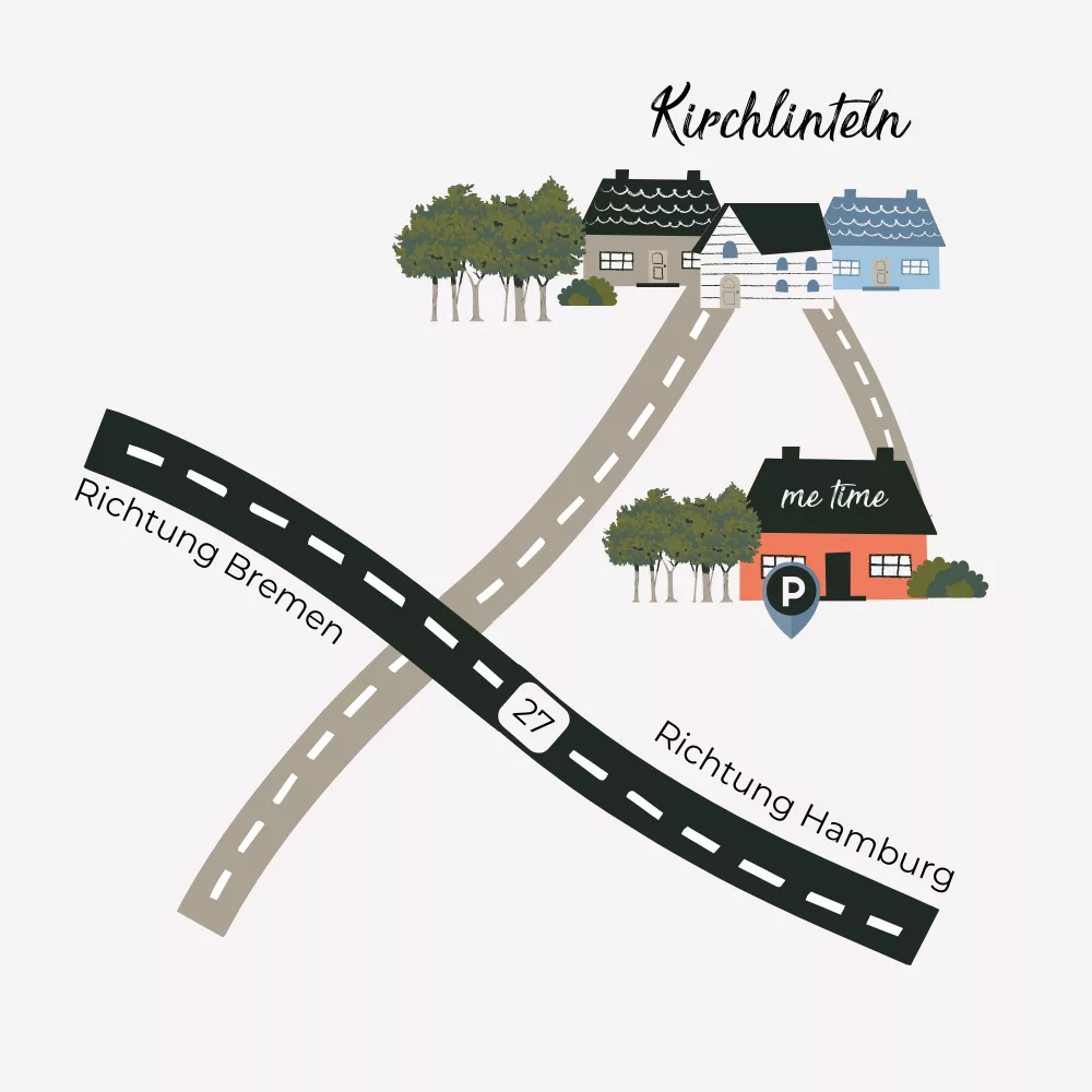 Aus Richtung Bremen, biegst du oben an der Ampel rechts ab, wenn du aus der Richtung Hannover kommst, biegst du oben an der Kreuzung nach links ab. Du fährst dann diese Straße für ca. 2km (auf der rechten Seite kommt nach 400m ein großen Laubwald), nach dem Ortsschild von Kirchlinteln fährst du weiter geradeaus bis du zur 1. Kreuzung nach ca. 200m kommst, hier biegst du rechts in die Weitzmühlener Str. ab und nach ca. 300m kommt auf der rechten Seite ein rotes Backsteinhaus, dort befindet sich mein me time Zuhause und du darfst dort direkt auf der Hofeinfahrt, vor der Garage parken.