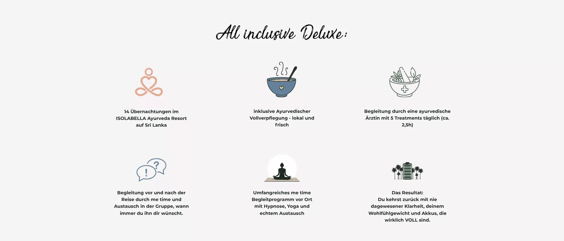 Hier setzen wir an: Wir lassen dich mit diesem Prozess nicht allein. „me time goes Sri Lanka“ verbindet die jahrtausendealte Panchakarma-Kur mit intensiver Begleitung durch Hypnose und Coaching.